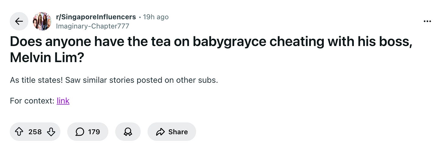 One need only look at r/SingaporeInfluencers, where users are comparing Melvin’s appearance to that of Grayce’s husband.