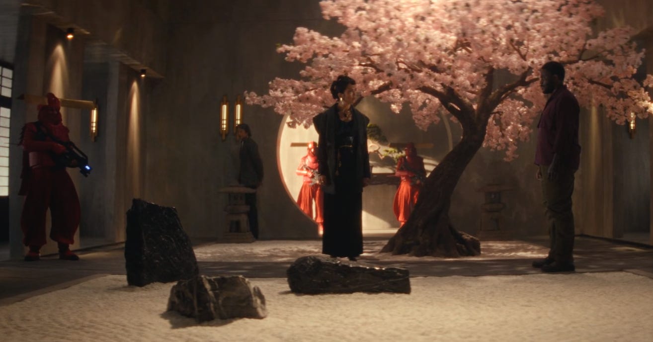 Yutani (no first name), the megacorp’s CEO, is draped in an aesthetic that really wants you to know she’s Japanese, complete with cherry blossoms, ornate period wear, and a vaguely oriental score that punctuates her scenes. While the Alien prequel film Prometheus (2012) explored the motivations of the Weyland half of Weyland-Yutani, Yutani has no such interiority and is no more than a side character whose purpose in the show appears to be a justification for visual spectacle.